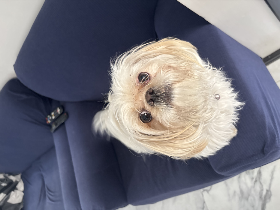 - "A small, fluffy, white and tan Shih Tzu dog with round, dark eyes, a black nose, and long, shaggy fur sits on a dark blue couch" by FM-IT8bv2, licensed under CC BY 4.0