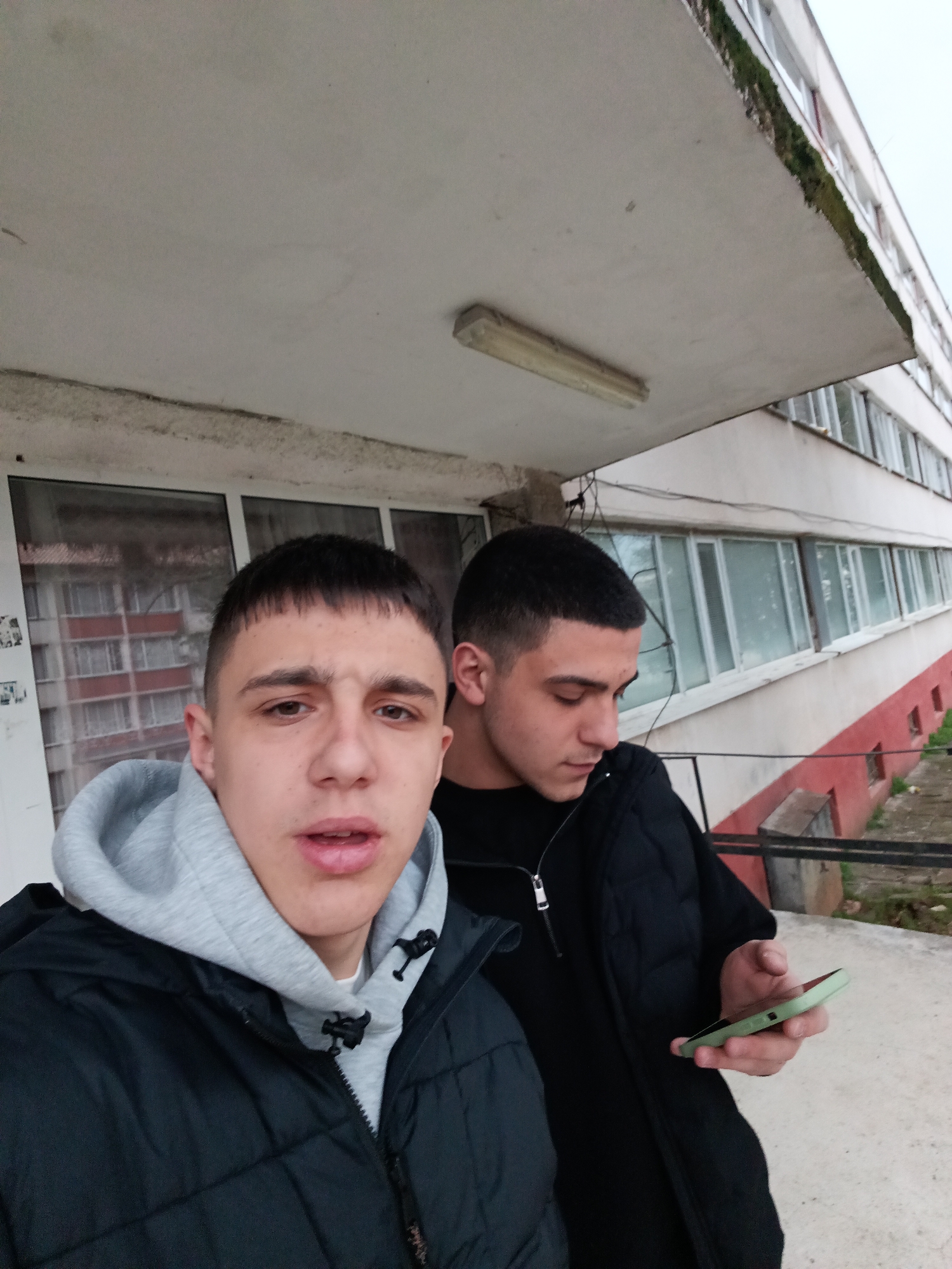 Two young males are depicted standing on a concrete surface beneath a concrete overhang in front of a multi-story building in Pravets, Bulgaria