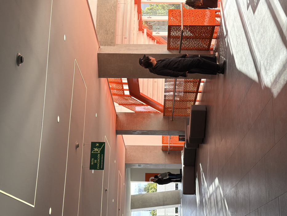 modern interior with gray walls and floors. An orange staircase with patterned metal railings is visible. A person in black clothing stands near the staircase. An exit route sign hangs on the wall. Further down the hallway, another group of people are visible. Sunlight streams in, casting shadows on the floor. There are dark gray sofas placed parallel to the wall.