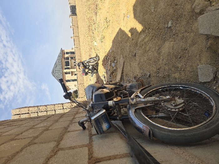 The scene depicts an undeveloped area within the city of DU, Nigeria, under a partly cloudy blue sky. In the immediate foreground on the left, an unfinished wall constructed of tan concrete blocks rises vertically. Leaning against this wall is a dark-colored motorcycle, displaying a worn appearance with visible chrome components, including its front wheel, spokes, and fender. The motorcycle's front tire rests on light brown, dry, uneven earth. Further into the mid-ground, a second dark-colored motorcycle is parked upright on the dusty, dry terrain. In the background, a modern, two-story house with a dark, possibly gray, hip roof and light-colored walls is visible. A low, block-constructed perimeter wall encircles the property of the house. No individuals are present in the image.