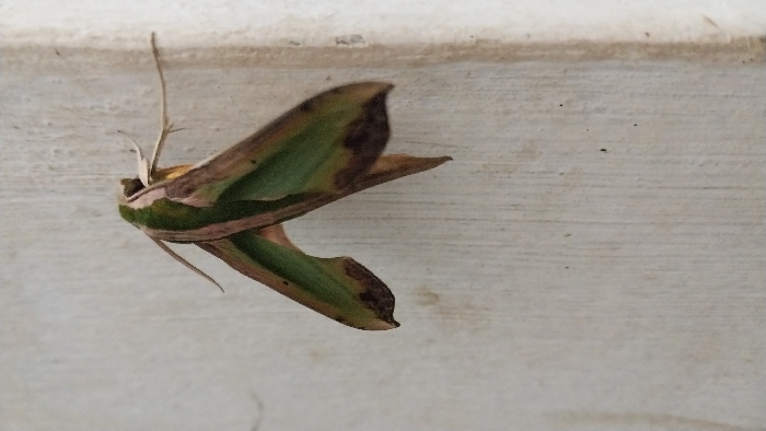- "A single moth, identified by its distinctive olive green and reddish-brown patterned wings, is observed resting vertically on an off-white, textured wall" by FM-t5Tl43, licensed under CC BY 4.0