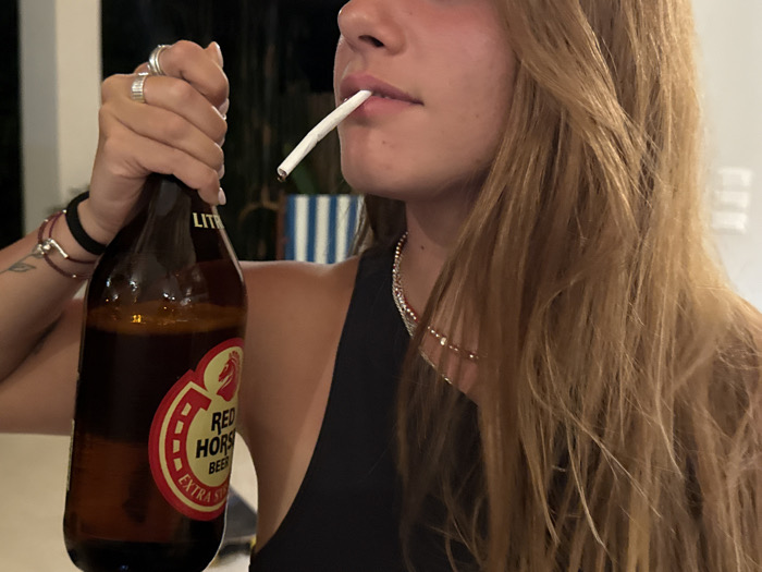 A female subject, visible from the mid-chest upwards, is depicted holding a liter-sized brown glass bottle of "Red Horse Beer Extra Strong" in her right hand. The bottle features its distinct red and yellow label with a horse emblem. A hand-rolled cigarette, white in appearance with a glowing ember at its tip, is positioned between her lips. Her long, light brown hair falls over her right shoulder and chest. She wears multiple silver-toned rings on her right hand and a thin, silver-colored beaded necklace. A dark bracelet with a silver clasp is partially visible on her left wrist. The background is dimly lit and out of focus, showing a white surface to the right and faint blue and white vertical stripes behind the bottle. The scene takes place in General Luna, Philippines.