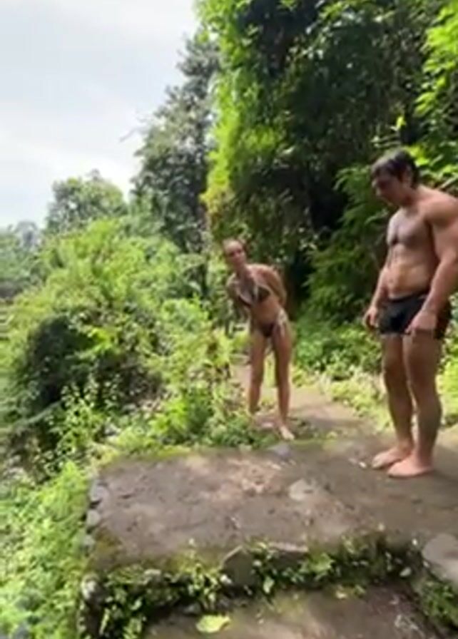 man diving off a stone ledge into a river surrounded by lush greenery. The scene is shot outdoors on a cloudy day. The river is surrounded by trees and dense vegetation. A woman in a bikini is standing near the edge of the ledge alongside the man, facing the camera. He is muscular and wearing black shorts with a pink stripe. He takes a running start and dives headfirst into the water. The camera follows his trajectory and captures the splash as he enters the water.