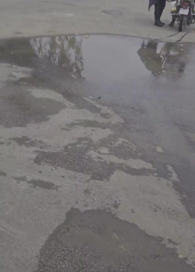 The scene is a gray, damp outdoor area, possibly a parking lot, with several puddles on the ground