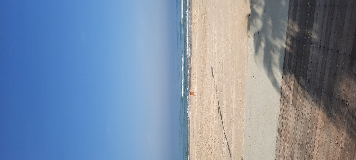 The image displays a coastal beach scene in Bat Yam, Israel. The upper third of the frame is dominated by a clear, bright blue sky with no visible clouds. Below this, the light blue Mediterranean Sea extends across the middle ground, exhibiting gentle waves with white foam crests near the shoreline. The expansive beach consists of light beige sand, appearing largely undisturbed and unoccupied. A single, orange, rectangular object, consistent with a safety buoy or marker, is situated on the sand, positioned between the surf and the foreground. No individuals are visible on the beach or in the water. The immediate foreground features a light-colored paved strip, which transitions to a dark brown wooden boardwalk composed of horizontal planks. Distinct, elongated shadows, originating from an unseen source likely foliage, are cast across both the boardwalk and the paved area, indicating direct sunlight.