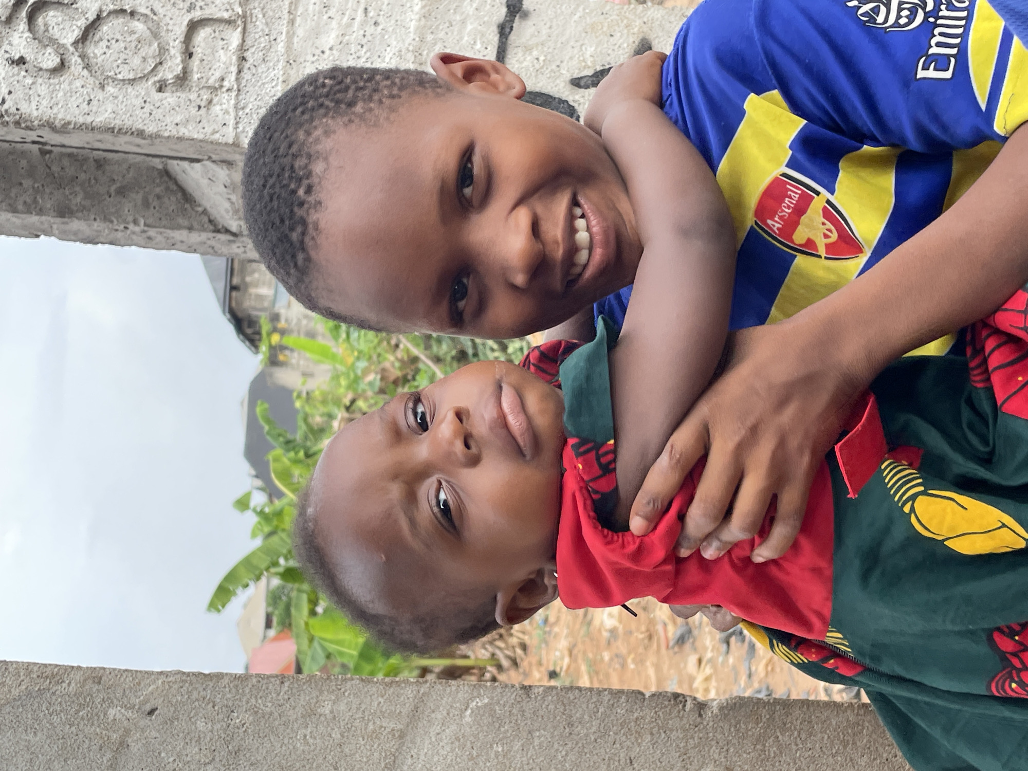 Two young, dark-skinned boys are posed close together for the picture. The boy on top is wearing a blue and yellow Arsenal Football Club jersey. He smiles brightly and is holding the other boy tightly. The second boy is wearing a red and green patterned fabric. The background includes a concrete wall with a partial word "SON" visible, some vegetation, and a building in the distance. The location appears to be Onitsha, Nigeria, based on the style of dress and environment.