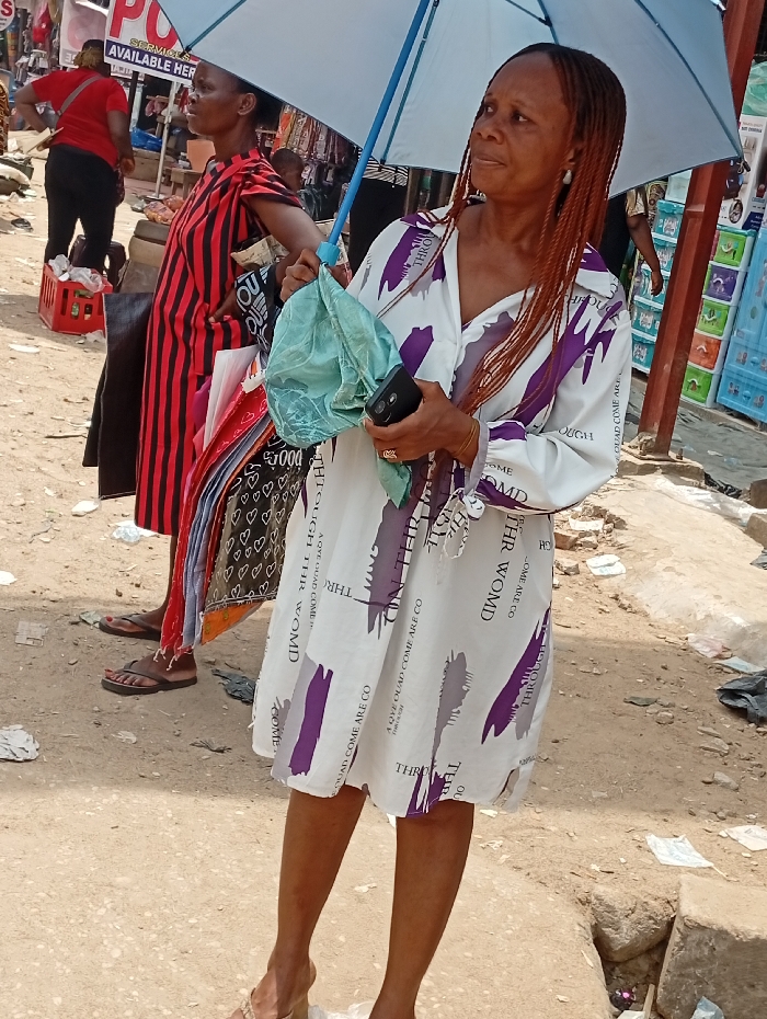 In an outdoor setting, a woman with long, reddish-brown braided hair holds an umbrella, wearing a white knee-length dress with purple and gray text and stripes. She holds a mobile phone in her hand. To her left, another woman in a red and black striped dress carries shopping bags. A third woman, wearing a red shirt and black pants, is seen in the background. The ground appears uneven and possibly dusty.