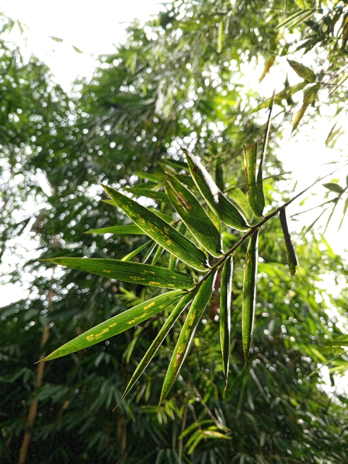 The image depicts a low-angle view of a dense bamboo grove in Silvino Lobos, Philippines. In the foreground, a cluster of vibrant green, elongated bamboo leaves are in sharp focus, extending diagonally from the lower-right towards the upper-left. These leaves exhibit minor yellowish-brown discoloration or spots, particularly along their surfaces. Sunlight backlights these leaves, creating a translucent effect and highlighting their edges. The background consists of heavily blurred bamboo foliage, appearing as a bokeh of bright, circular, out-of-focus light spots against a darker green backdrop, indicating bright ambient light filtering through the canopy. No people, animals, or man-made objects are visible.