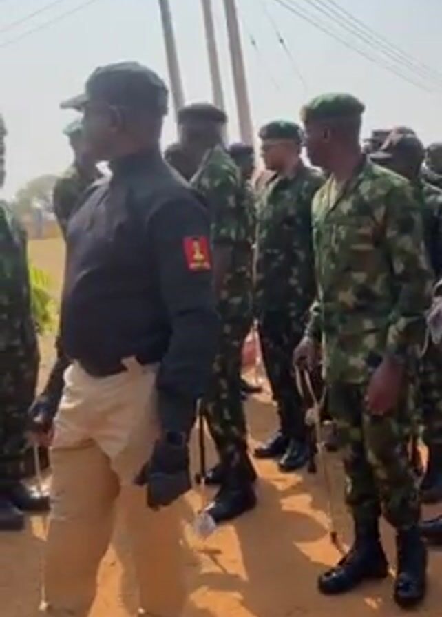 group of people in military uniforms standing outdoors on a sunny day. The people are standing on a sandy, unpaved area. A line of red bricks is partially visible on the ground. Several power poles with wires are visible in the background. The group is comprised of people in green camouflage uniforms, and at least one person in a black shirt with khaki pants. Some of the individuals are carrying batons. The man in the black shirt is standing with his hands clasped in front of him and his gaze directed towards someone out of view. Several others are looking in the same direction.