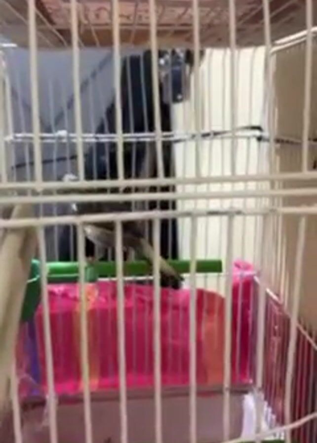 A small bird with grayish-brown plumage is inside a white, rectangular birdcage. The cage has vertical bars and a colorful pink and orange liner at the bottom. There are green perches inside the cage. The background is blurry, but it appears to be indoors with light-colored walls and a dark object. The bird is perched on one of the green perches and appears to be looking around. The camera is handheld and slightly shaky.