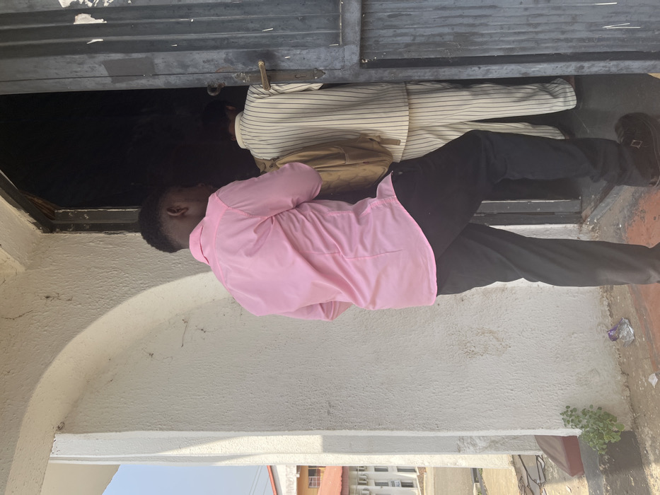 A forensic examination of the image reveals two individuals entering a doorway under daylight conditions in Osu, Nigeria. The first individual, a Black male with short dark hair, is seen from the rear, wearing a pink long-sleeved button-up shirt, black trousers, and black patent leather shoes. He is in the process of stepping through a dark grey, possibly metallic, doorway. Partially obscured behind him, and further inside the doorway, is a second individual, also viewed from the rear, wearing a cream-colored, vertically striped long-sleeved shirt and matching trousers. This second person carries a tan-colored backpack on their back. The doorway leads into a dimly lit interior. To the left of the doorway is a textured white building wall with an architectural archway overhead, casting a shadow. The base of the wall shows some dirt accumulation and a small cluster of green foliage growing from the ground. A crumpled silver foil wrapper is visible on the ground near the wall. In the distant left background, structures with red roofs and another white building are visible under a clear, light blue sky, suggesting an outdoor urban or suburban environment.