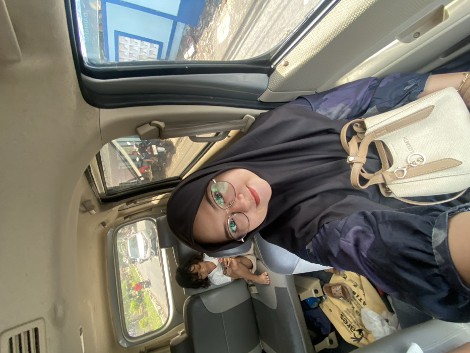 A woman in glasses and a hijab smiles at the camera inside a car. A small child lies in the back seat, partially visible near the car window. A tan purse hangs from the woman's shoulder. The vehicle's interior is visible, including part of the dashboard and seat. Reflected outside the windows is a street scene with other vehicles and buildings.