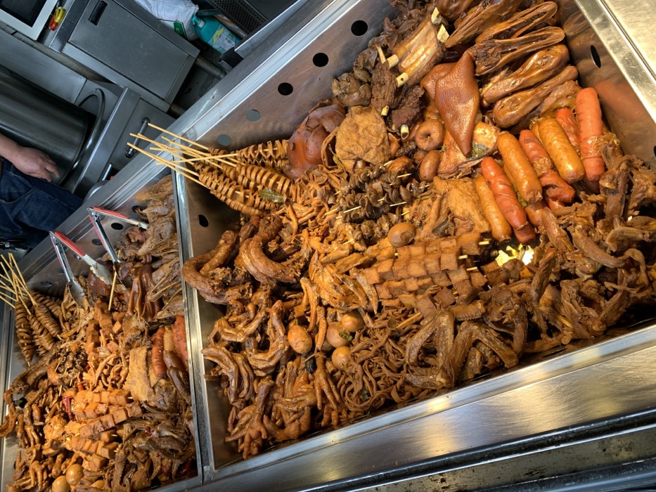 - "This image captures a street food stall or market display in Xihu District, China, featuring two large, rectangular stainless steel trays filled with various braised and marinated food items" by FM-R7dQ13, licensed under CC BY 4.0