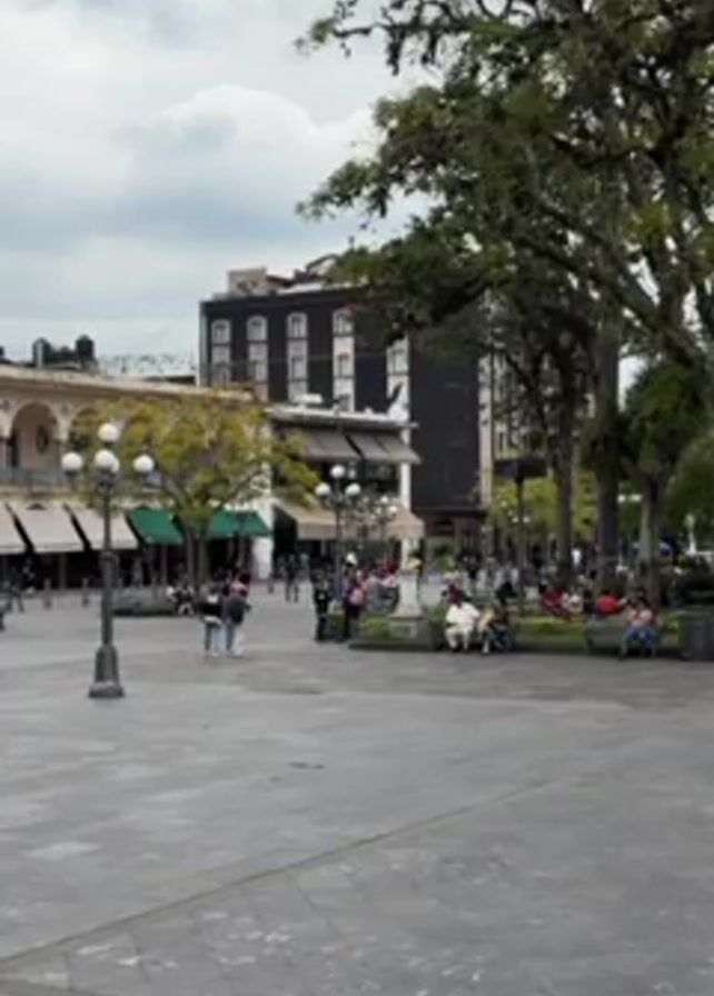 public square on an overcast day. People are walking around or sitting on benches in the park. There are buildings visible in the background, as well as trees and lampposts. A person in a red shirt and white shorts walks across the square in the foreground. The ground is paved with stone tiles.