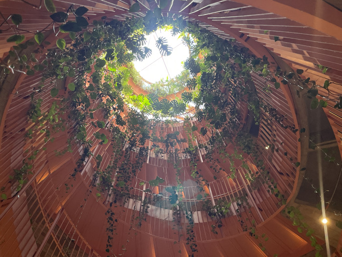 The image displays an upward view into a circular lightwell within El Cielo Medellín restaurant, located in El Poblado, Medellín, Colombia. The lightwell is characterized by curved, multi-story walls constructed from numerous vertical slats or ribs, presented in a light orange or peach hue. Dense green foliage, comprising various trailing plants resembling Pothos and larger, distinctly fenestrated leaves consistent with Monstera deliciosa, cascades downwards from the top rim and along the interior surfaces of the structure. A bright, natural light source, presumably a skylight, is visible through the circular opening at the apex, illuminating the vegetation and architectural elements. No individuals or dynamic actions are present within the frame.