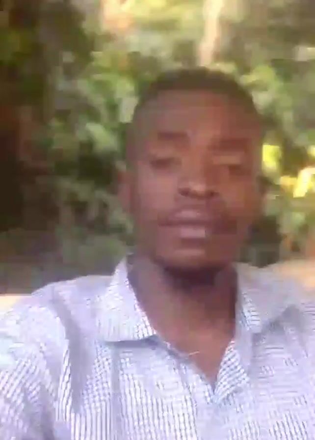 A man with dark skin and short black hair is facing the camera. He is wearing a light blue and white striped short-sleeved shirt. The background is blurry but appears to be outdoors with green foliage. He is speaking.