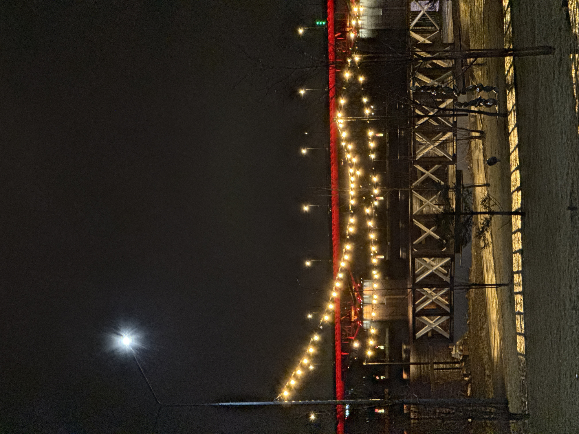 Here is a description of the image: This is a nighttime image of the pedestrian bridge across the Yenisey River in Krasnoyarsk, Russia. The bridge is decorated with vertical rows of lights and a red beam along the edge facing the camera. On the right of the bridge is a decorative structure with white cross-like beams. The water of the Yenisey River reflects light. A street lamp shines brightly in the lower-left corner of the image. The sky is dark.