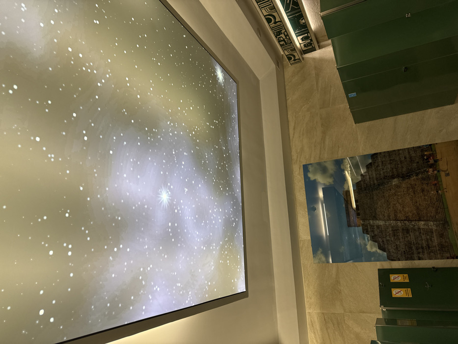 The scene depicts the interior of a public restroom located within the Felipe Ángeles International Airport (AIFA) in Santa Lucía, Mexico. A large, rectangular illuminated panel, recessed into the ceiling, displays an image of a starry sky or galaxy, featuring diffuse white and light-yellow nebulosity with numerous bright white points and several prominent starburst effects. The surrounding ceiling and upper wall sections are painted in a light, neutral tone. The lower walls are clad in light beige or cream-colored tiles. On the left wall, a large, vertically oriented print or poster displays the ancient Mayan pyramid of Chichen Itza (El Castillo) under a partly cloudy sky, with several small human figures visible at its base within the image. Reflections of internal lighting and the starry ceiling panel are visible on the surface of this print. To the left of the Chichen Itza print, a dark green restroom stall door is visible, bearing two yellow signs with red diagonal lines and hand symbols, likely indicating a closed or out-of-order status. To the right of the Chichen Itza print, a row of identical dark green restroom stalls extends along the wall. Above these stalls, a decorative frieze composed of dark green panels with light-colored, geometric, Mesoamerican-inspired patterns runs horizontally. No individuals are present in the observable immediate environment.