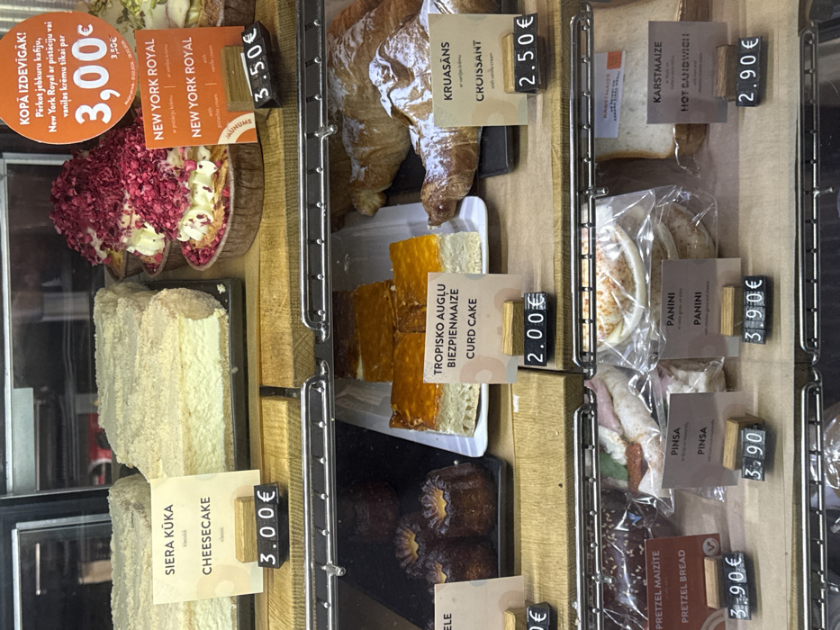 A bakery display case showcases various pastries and sandwiches. Cheesecake and New York Royal cake are priced at €3.00. Croissants cost €2.50, while curd cake is €2.00. Several sandwiches, including panini, pinsa, and hot sandwiches, are available at €3.90 and €2.90 respectively. Pretzle bread is priced at €3.90. There is a promotional sign advertising a coffee and New York Royal combination for €3.00.