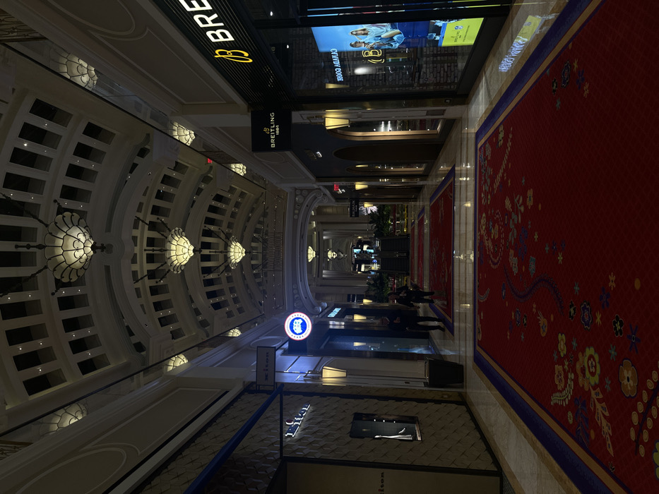 A long, high-end shopping corridor features decorative chandeliers illuminating the vaulted ceiling with archways. The floor is lined with a plush, red patterned carpet with an ornate border. High-end boutiques such as Breitling line one side of the corridor. People are walking in the distance, creating a sense of activity in the luxurious space.