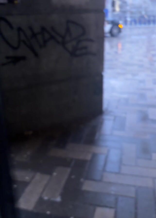 A hand opens a metal door to reveal a view of a street in front of a large stone building with red window frames and doors, reminiscent of a cathedral. The street is paved with grey bricks in a herringbone pattern, reflecting light from streetlights and vehicle tail lights due to wet conditions. A few people and cars are visible in the distance. The sky is overcast. A section of the building frames the view.