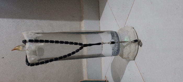 - "The image displays a decorative electric candle lamp with a black tasbih (prayer beads) draped over it, situated on a tiled floor against a plain wall" by FM-dHZ8d2, licensed under CC BY 4.0