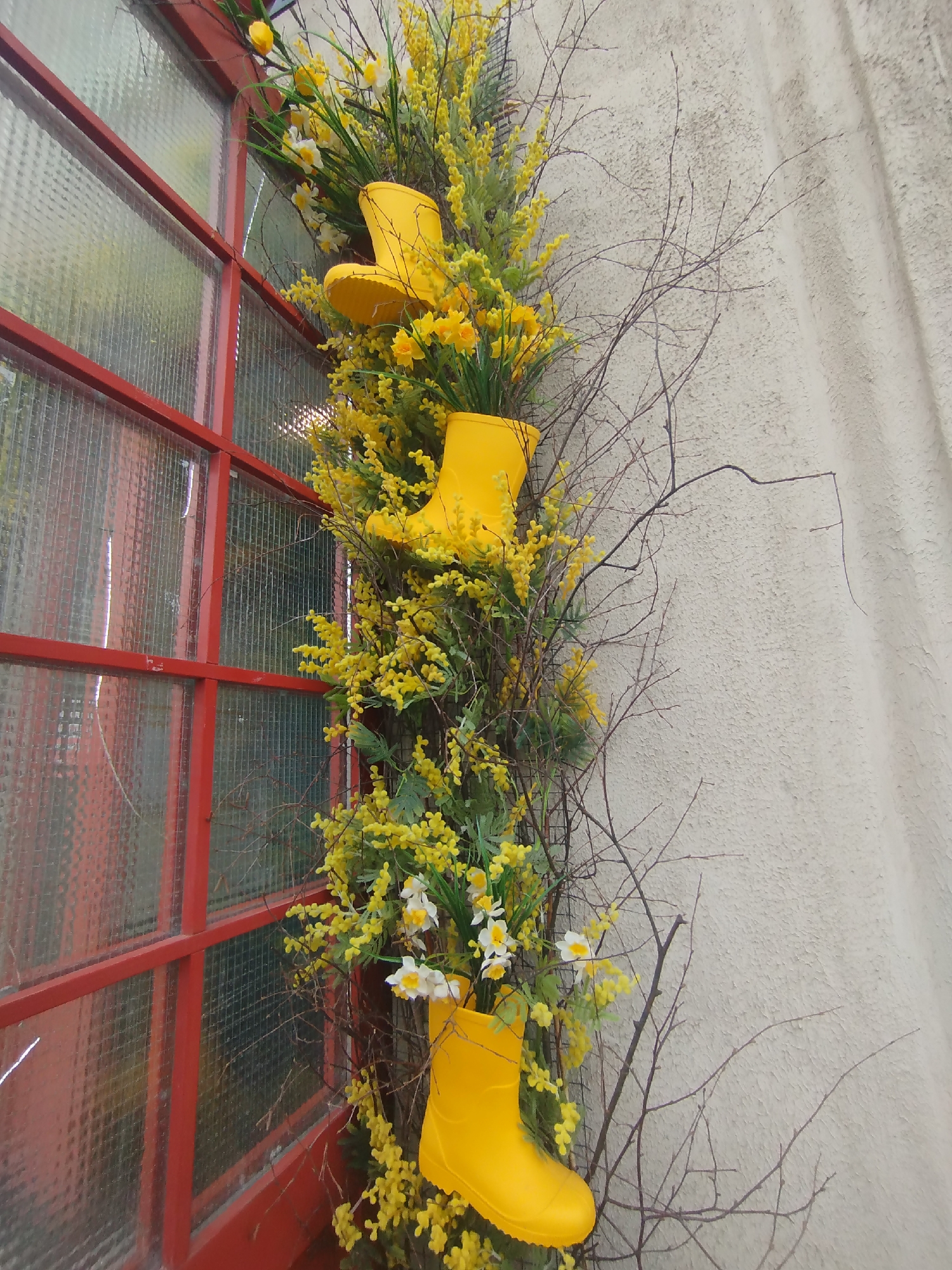 A still life is captured near a red-framed window with rippled glass, positioned beside a textured beige wall. Yellow flowers and yellow rubber boots are prominent, arranged vertically along with bare branches. The rubber boots are at different heights, with one near the window, one in the middle, and another at the bottom. The flowers and branches add depth and texture to the scene. The location is presumed to be Izhevsk, Russia.