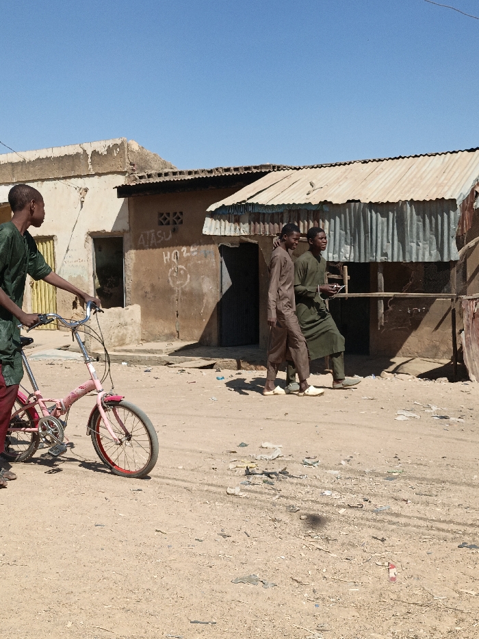 The image depicts a daytime scene on a dusty street in the city of Zango, Nigeria