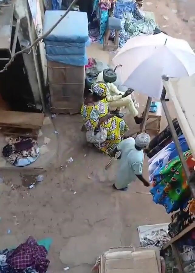 n outdoor market scene. A woman wearing a yellow dress with a floral pattern is seated on a low stool, looking at her phone. A man in a light yellow suit and a green hat is seated nearby, also looking at his phone. They are sitting under a white umbrella. The ground is dirt and scattered with debris. Stacks of goods are visible in the background, including fabrics and mattresses. The scene suggests a casual, everyday moment in a busy market environment.