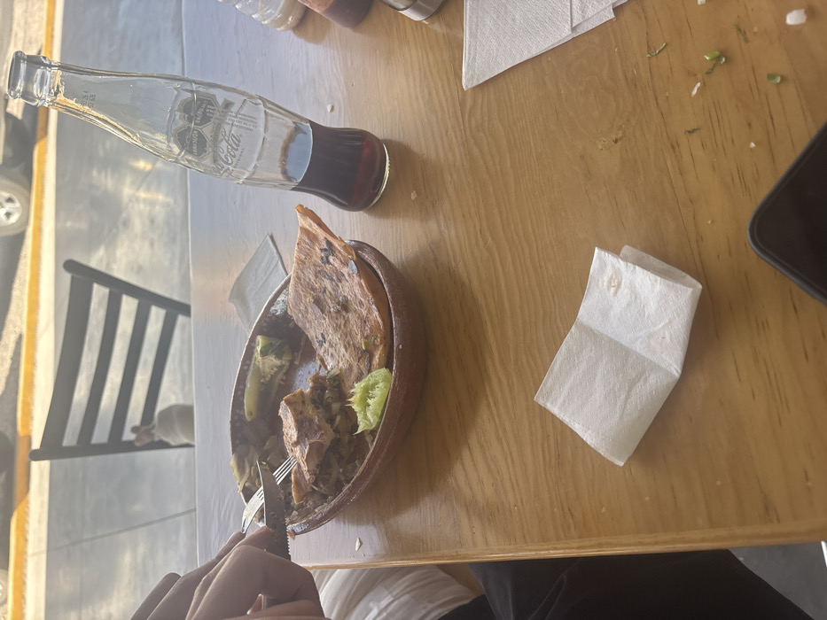 A top-down view shows a table setting with a half-empty Coca-Cola bottle, a terracotta dish containing a meal with what appears to be meat, vegetables, and a tortilla-like wrap