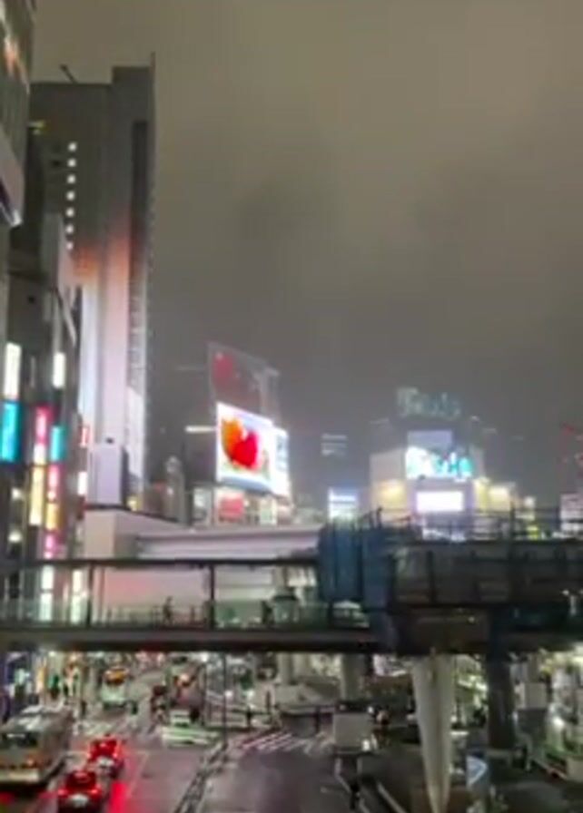 n elevated perspective of an urban intersection at night in what appears to be a city in Japan. It is overcast, possibly rainy, as the roads are wet and reflect the red taillights of cars. There are tall buildings with digital billboards displaying various images, including one featuring a large red heart and a dog. A pedestrian bridge or walkway spans the road. There are people walking on the sidewalks. The overall atmosphere is hazy.