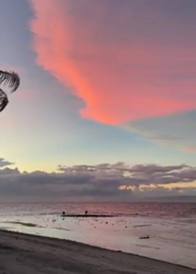 tranquil beach scene at dusk or dawn, dominated by a colorful sky. A large pink cloud stretches across the upper right portion of the frame. Below it, layers of lower-lying clouds appear in shades of gray and mauve. The sea is calm, with a few figures visible at a distance, seemingly wading or standing in the water. The beach is sandy, with dark streaks suggesting recent high tide marks. In the foreground, the silhouette of a palm tree appears on the left side of the frame, with other vegetation near the base. The scene is peaceful and serene, capturing the natural beauty of the shoreline and sky. Some faint voices are heard.