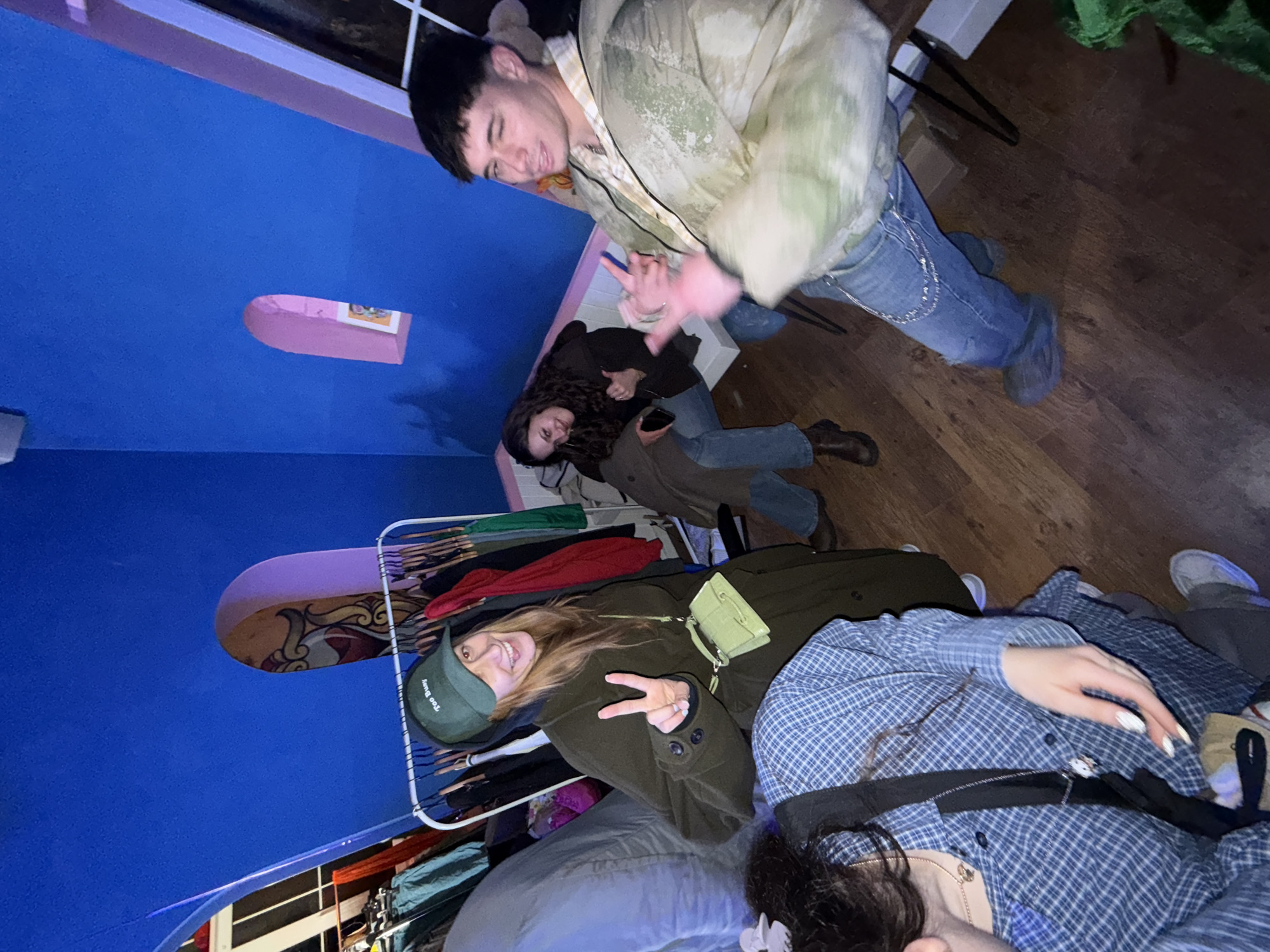 Several people are gathered indoors, seemingly in a private residence. The room features a striking blue wall with a small, decorative window. A clothes rack laden with assorted garments is visible. The floor is wooden. One person stands in the foreground, gesturing with their hands. Another individual lies on what appears to be a bed or cushion. The location is presumed to be Sofia, Bulgaria, based on the prompt instructions, but there are no visible elements in the image to confirm this.