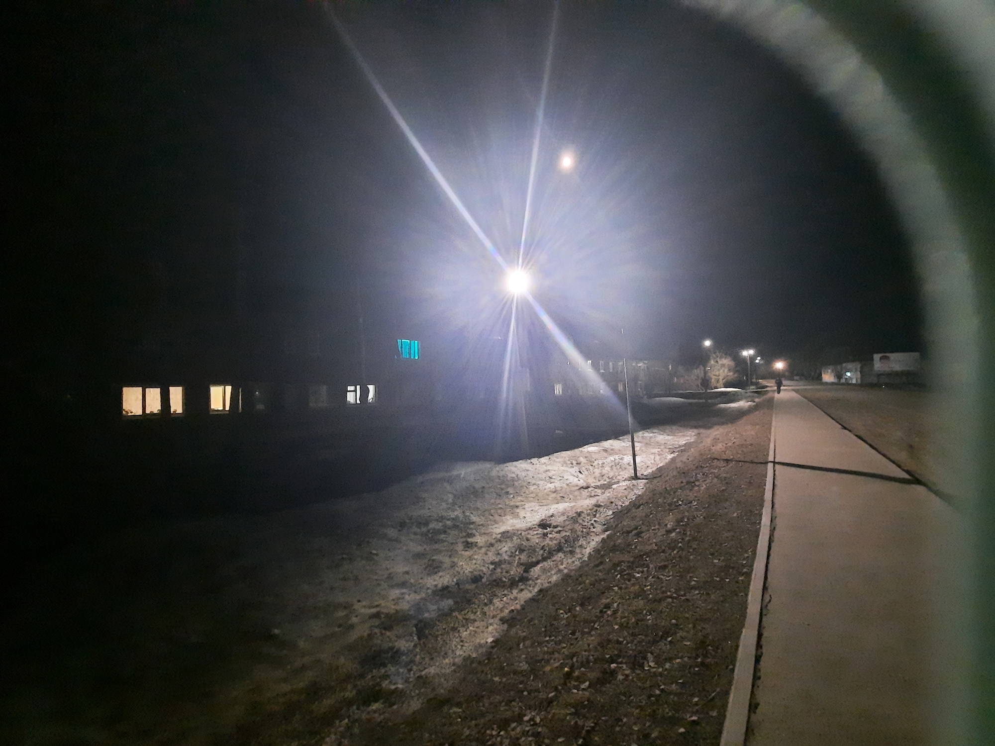 night scene in what appears to be a residential area. A bright streetlight dominates the view, creating intense light flares. To the left of the light, a building with several illuminated windows can be seen. A narrow strip of land, possibly a ditch or a snow-covered area, lies between the building and a sidewalk. The sidewalk stretches along the right side of the image, leading towards a distant figure walking. Additional streetlights illuminate the path further away. The overall environment is dark with concentrated light sources. According to geolocation, the city is Krasnogorskoye, Russia.