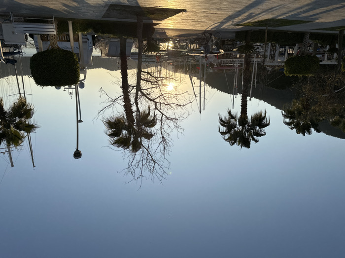 The image depicts a sunset scene along a marina in Fethiye, Turkey. The sun, partially obscured by a bare tree and boat masts, is low on the horizon, casting a golden glow on the water and a paved walkway, resulting in long, dark shadows. The sky above is clear and light blue. In the foreground, a wide, light-colored paved walkway extends horizontally across the frame. To the left of the walkway, decorative white arbors and manicured bushes are visible. A prominent palm tree stands to the left, and another, along with a bare deciduous tree, is centrally located. On the right, a white park bench is situated next to a round, manicured green bush. A tall street lamp with a spherical fixture rises in the mid-right. The midground and background feature a marina with numerous boats of varying sizes docked in the calm water. Sailboats with tall masts are visible throughout the marina, along with several motor yachts, including one with a white hull and superstructure partially visible on the right. Beyond the marina, a range of hills or mountains covered in vegetation forms the distant background, silhouetted against the sky. One individual on a bicycle is observed in the mid-left, riding along the paved walkway towards the right, their silhouette distinct against the sunlit water.