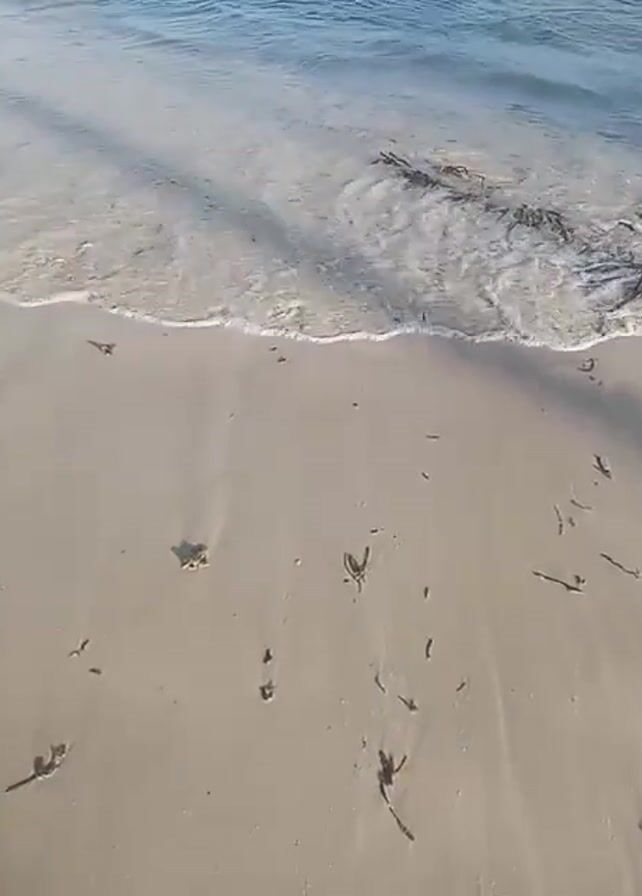 beach with light-colored sand and clear, blue water lapping the shore. The beach is covered with small pieces of seaweed and other debris. The shadows of trees or structures are visible on the sand.