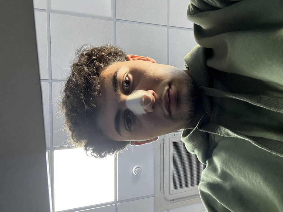 A young male individual is depicted in a close-up, upward-angled shot within an indoor environment in Jibb as-Safa, Syria. He has dark, curly hair and light facial stubble. A white medical bandage is applied to the bridge and tip of his nose. He wears a dark green hooded sweatshirt and maintains a direct, neutral gaze towards the camera. The background consists of a white suspended ceiling with a grid pattern, featuring square LED light panels, one of which is brightly lit. An air conditioning cassette unit with a white grille and a red circular fire alarm detector are visible on the left side of the frame.