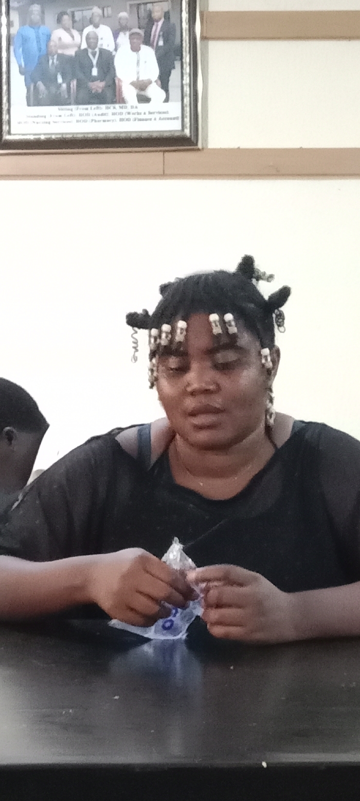 The scene depicts an indoor environment, likely an office or administrative area within an institutional building in Lokoja, Nigeria. A dark-skinned woman is seated at a dark, reflective table, viewed from the chest up. Her black hair is styled in multiple small knots, some adorned with light-colored beads or rollers. She wears a black top, possibly sheer, revealing a strap on her right shoulder. Her hands are actively manipulating a small, clear plastic packet featuring a blue circular graphic. To her left, the top of a second individual's head and upper back are partially visible. The background consists of a light-colored wall with a framed group photograph. The photograph displays approximately eight individuals, predominantly men, in formal and semi-formal attire. Text beneath the photograph identifies titles including "VC, MD, BA", "HOD (Audit)", "HOD (Works & Services)", "HOD (Nursing Services)", "HOD (Pharmacy)", and "HOD (Finance & Account)". A horizontal wooden trim runs across the wall below the framed picture. Small white particulate matter is scattered on the table surface.