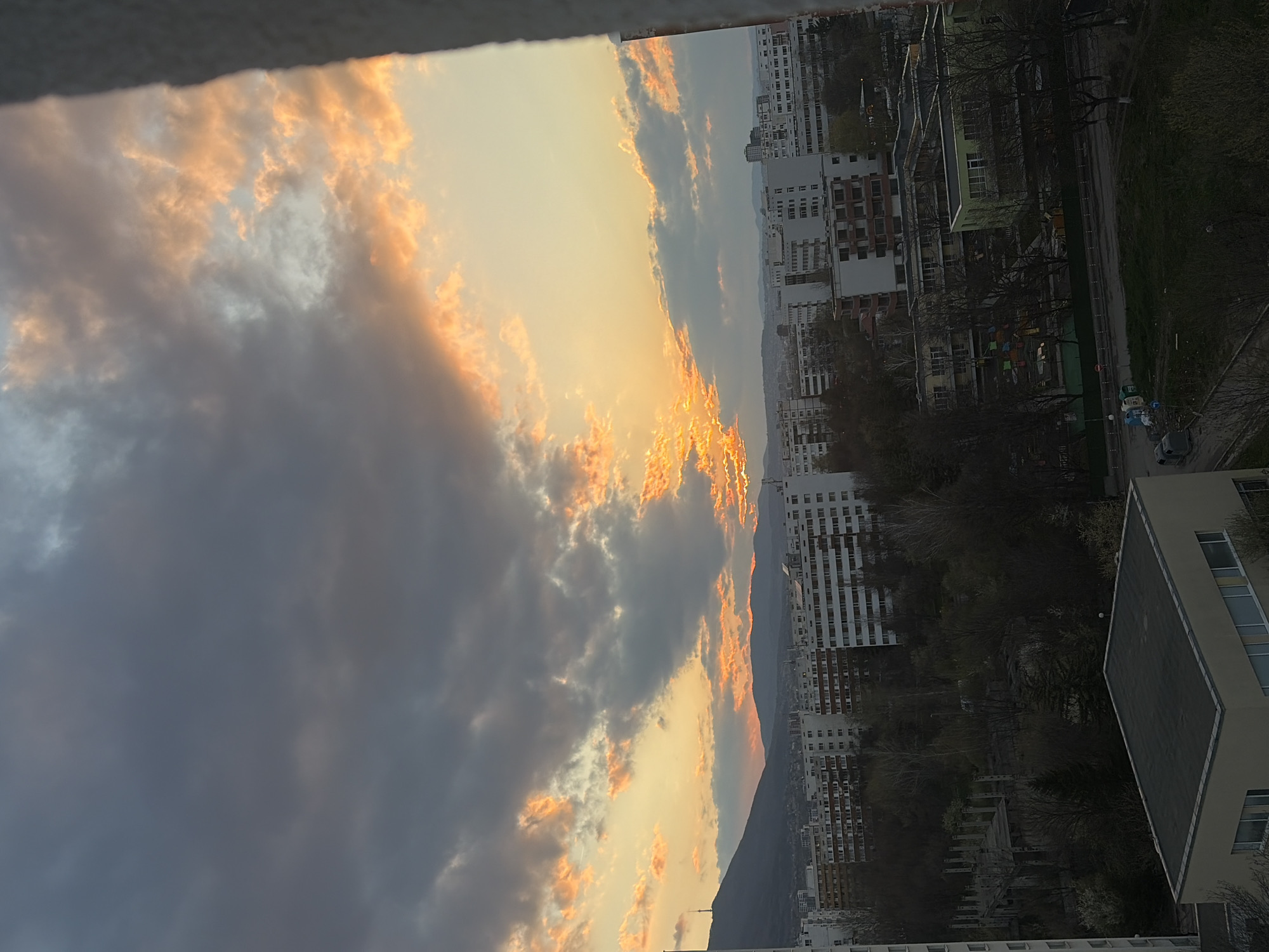 n urban landscape at sunset, likely in Sofia, Bulgaria. The sky is filled with clouds, some dark gray and others illuminated with orange and yellow hues from the setting sun. The sun's rays are visible breaking through the clouds. Below the horizon, there is a view of the city. High-rise apartment buildings dominate the view, with some green spaces (likely parks or gardens) interspersed among them. The photograph appears to have been taken from a high vantage point, possibly from a tall building. The foreground of the image shows part of the building where the photograph was taken.