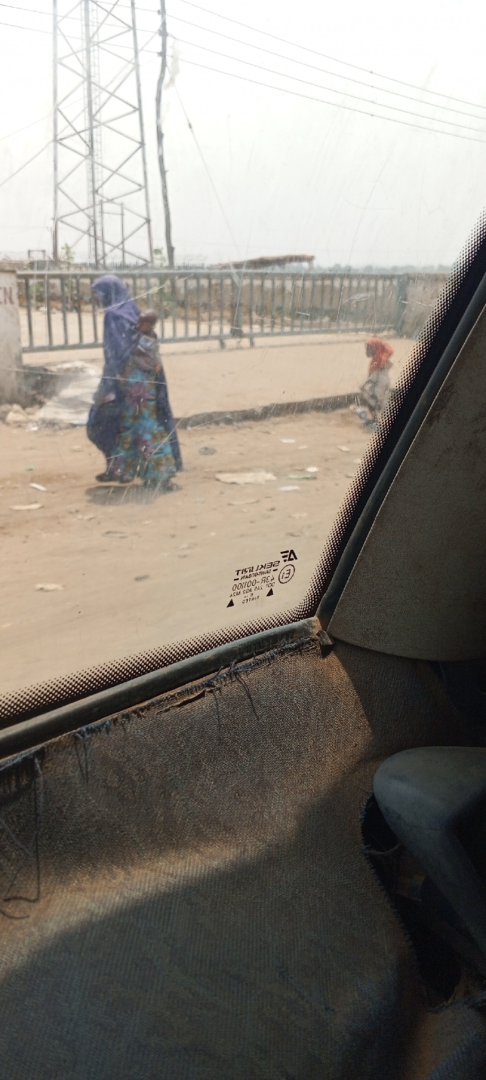The scene depicts a street in Laminga, Nigeria, observed from the interior of a vehicle. The immediate foreground shows the vehicle's worn, dark blue or gray fabric interior, with fraying visible along the bottom edge of the windshield. The windshield glass bears inverted manufacturer markings, including "SEKURIT" and "E1 43R-001100," and exhibits multiple surface scratches. Outside the vehicle, a dirt or sandy road occupies the midground, scattered with various pieces of litter. A woman, clad in a long blue head covering and a patterned long dress, walks from left to right, carrying an infant secured to her back with a patterned cloth. To her right and slightly behind, a second individual, wearing a red head covering and lighter-colored clothing, walks away from the viewer. A metal barrier or fence runs horizontally across the mid-distance. On the far left, a concrete block with the partial visible inscription "EN" is present. The background features a tall metal lattice power pylon positioned on the left, with power lines stretching across a hazy or overcast sky. Distant, indistinct structures are visible beyond the fence line.