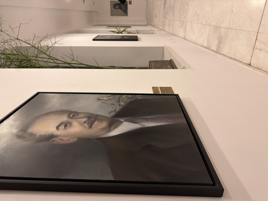 An interior shot depicts a brightly lit hallway in Plovdiv, Bulgaria, likely within an art gallery or institutional building. The primary subject is a large, rectangular framed portrait mounted on a white wall in the foreground on the left. The portrait features a light-skinned male with dark, combed-back hair, a prominent mustache, and a faint smile. He is depicted wearing a dark suit jacket, a white shirt, and a striped tie, against a muted grey background with subtle botanical elements. The frame is black and sleek. Two small, brass-colored informational plaques are affixed to the wall directly below the portrait. The hallway extends into the background, characterized by uniformly white walls and a light-colored, veined marble tiled floor. Along the right side of the hallway, a shallow ledge or half-wall is present, upon which a tall, slender potted plant with numerous thin green stems is situated in a woven brown container. Further down the hallway, additional framed artworks are visible on the white wall, including another plant in a similar pot. In the distant background, a framed portrait of a person with dark hair is discernible, with a dark, indistinct figure partially visible to its right, suggesting a person standing or moving. The overall environment is well-maintained and appears to be an exhibition space.
