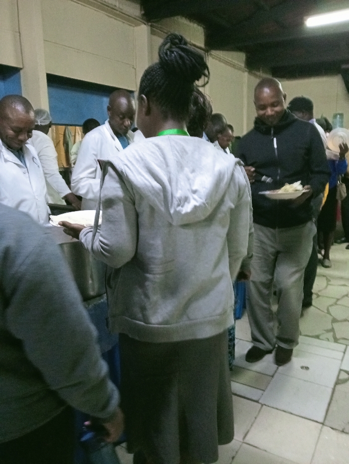 A line of people are getting food at what appears to be a cafeteria. Several people are wearing lab coats, and one man has a plate of food. The person closest to the camera is wearing a gray hooded sweatshirt, and the next person in line has a hairstyle with the hair piled on top of the head. The floor is tiled.