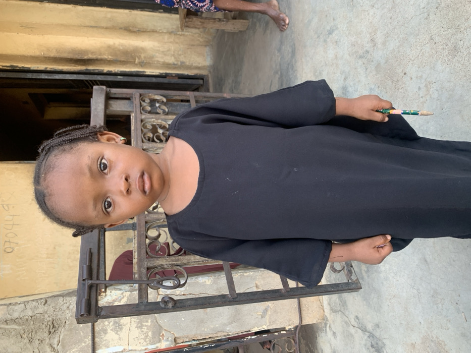 The image depicts a young child standing outdoors in Okene, Nigeria