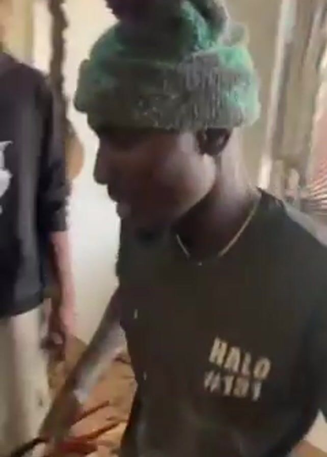 Two men are working in what appears to be an indoor construction zone. The first man, who is in the foreground, is wearing a black t-shirt with a faded graphic, dark pants, and a colorful knit hat with a pompom. He is covered in dust. He is gesturing and appears to be speaking. The second man is behind him, wearing a red and white baseball cap, a blue t-shirt, and tan pants. He seems to be walking in the background. The floor is covered with dirt and debris, and there is a window with bars in the background. The walls are white. The first man picks up what looks like a tile cutter.