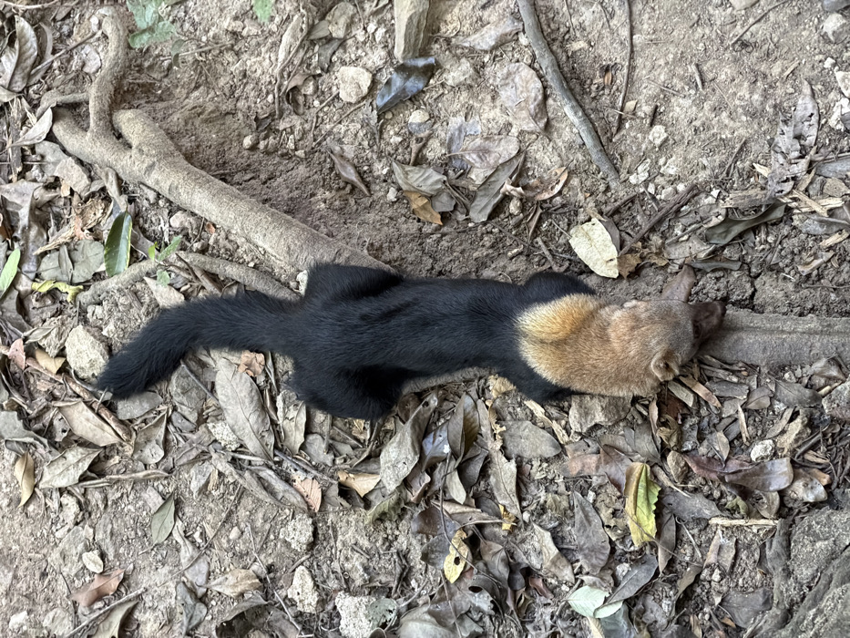 A long, slender animal lies motionless on a forest floor covered in dry leaves and dirt. Its body is primarily black fur with a bushy tail. The head and neck area display a striking contrast, covered in a golden-brown or tan fur. The animal appears to be deceased or resting. Roots and branches are scattered around it.