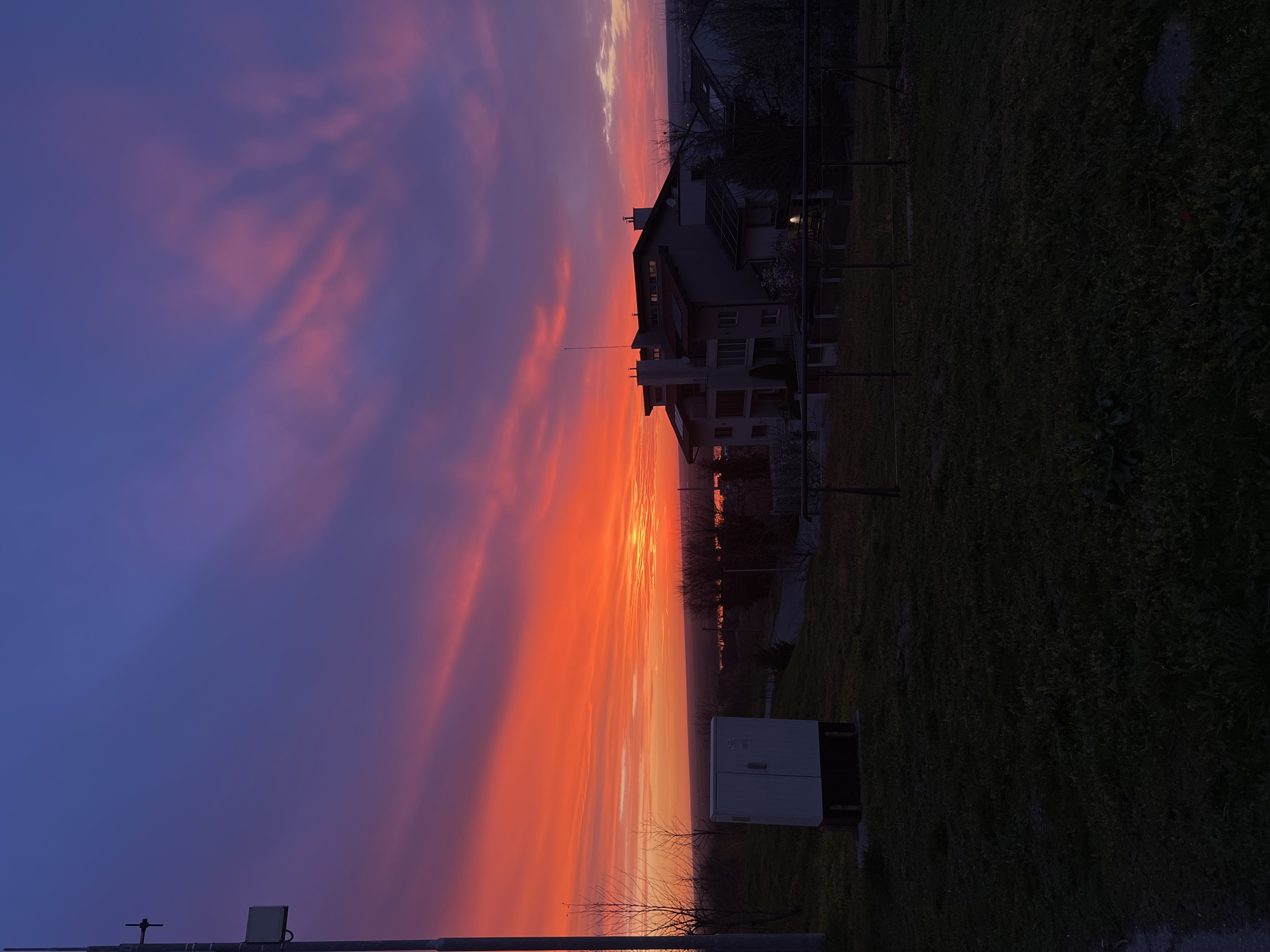 The image captures a vivid sunset scene in Ruse, Bulgaria. The sky displays a gradient of colors transitioning from deep blue to fiery orange and pink. A multi-story building is visible on the right side of the frame, appearing silhouetted against the bright sky. Adjacent to the building is a dark green area of land that is most likely grass. In the foreground, there is a white utility box or electrical cabinet and metal poles. The image is taken from a low angle, emphasizing the height of the sky and the silhouette of the building against the sunset.