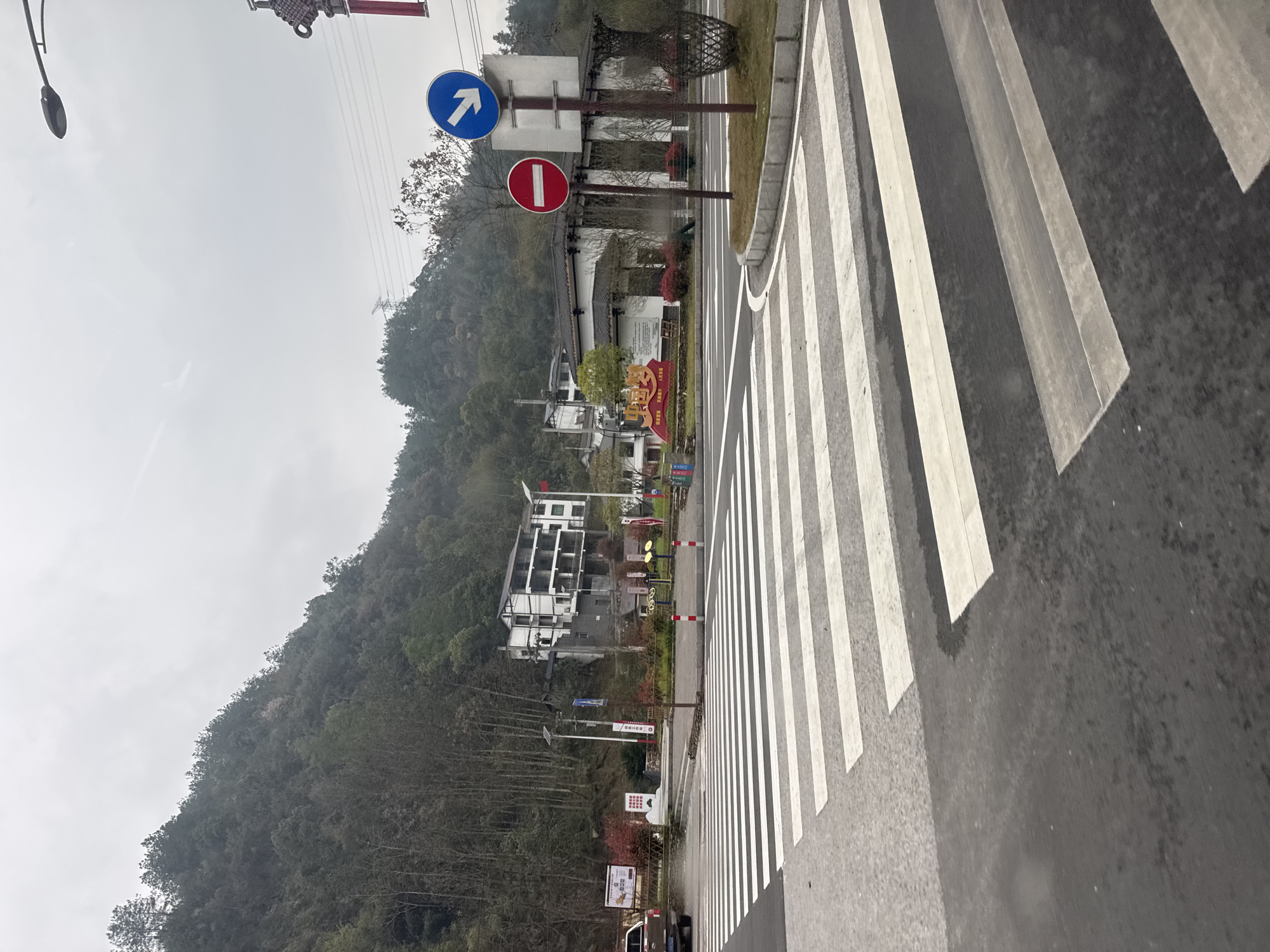 The image displays an outdoor scene at an intersection in Yongding District, China, under an overcast sky. In the foreground, a multi-lane asphalt road features a prominently marked zebra pedestrian crossing with wide white stripes. The road surface exhibits signs of dampness. To the immediate right of the crossing, a landscaped median island with a curved concrete curb contains low, red-leafed shrubs and sparse trees. Mounted on a pole within this median are two circular traffic signs: an upper blue sign with a white downward-right arrow, and a lower red sign with a white horizontal bar indicating "No Entry." Adjacent to these signs, a large, dark, intricately woven sculpture resembling a vase or basket stands. On the left side of the road, a light-colored pickup truck is partially visible, oriented leftward. Beyond the curb on this side, several informational signs with Chinese characters, accompanied by vertical banners on poles, are positioned amidst red-leafed shrubs and trees. Further into the midground, a multi-story building with white walls, dark roofs, and multiple balconies is situated on the slope of a mountain. To its right, a lower, traditional-style building with white walls and a dark tiled roof is present. The background is dominated by a steep, densely forested mountain slope, covered with a mixture of evergreen and bare deciduous trees, indicating a cooler climate or season. Utility poles and power lines are visible against the hillside in the upper-right background, with a distant metal lattice transmission tower faintly discernible on a far ridge. No individuals are present or actively engaged in the scene.
