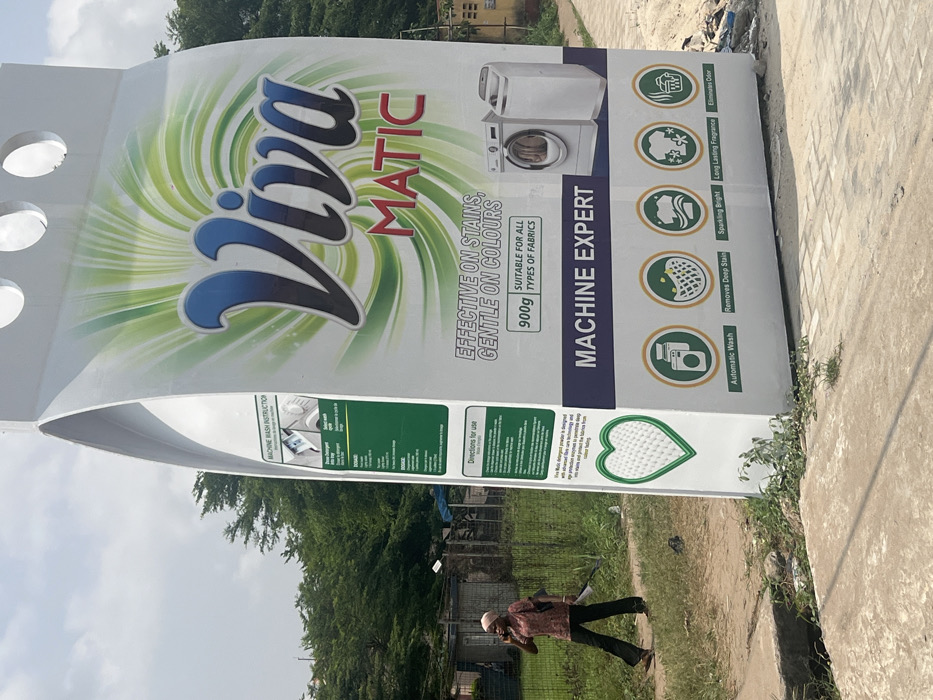 This image depicts an outdoor street scene in Ijanikin, Nigeria. A large, freestanding commercial advertisement, shaped like an oversized white detergent box with blue, green, and red branding for "Viva MATIC," dominates the right foreground. The display features text including "EFFECTIVE ON STAINS, GENTLE ON COLOURS," "900g SUITABLE FOR ALL TYPES OF FABRICS," and "MACHINE EXPERT." It also shows images of a front-loader and top-loader washing machine, and five circular icons detailing benefits: "Automatic Wash," "Removes Deep Stain," "Sparkling Bright," "Long Lasting Fragrance," and "Eliminates Odor." A side panel displays "MACHINE WASH INSTRUCTION" and "Directions for use," along with a green heart outline. To the left of the display, an adult female, wearing a light-colored head covering, a patterned short-sleeved top, and dark trousers, walks from left to right on a dirt pathway, actively speaking on a mobile phone held to her right ear. The immediate ground consists of a dirt path with sparse vegetation, a concrete drainage curb, and a paved area beneath the advertisement. The background features a chain-link fence, partially obscured buildings, and dense green foliage under a cloudy sky.