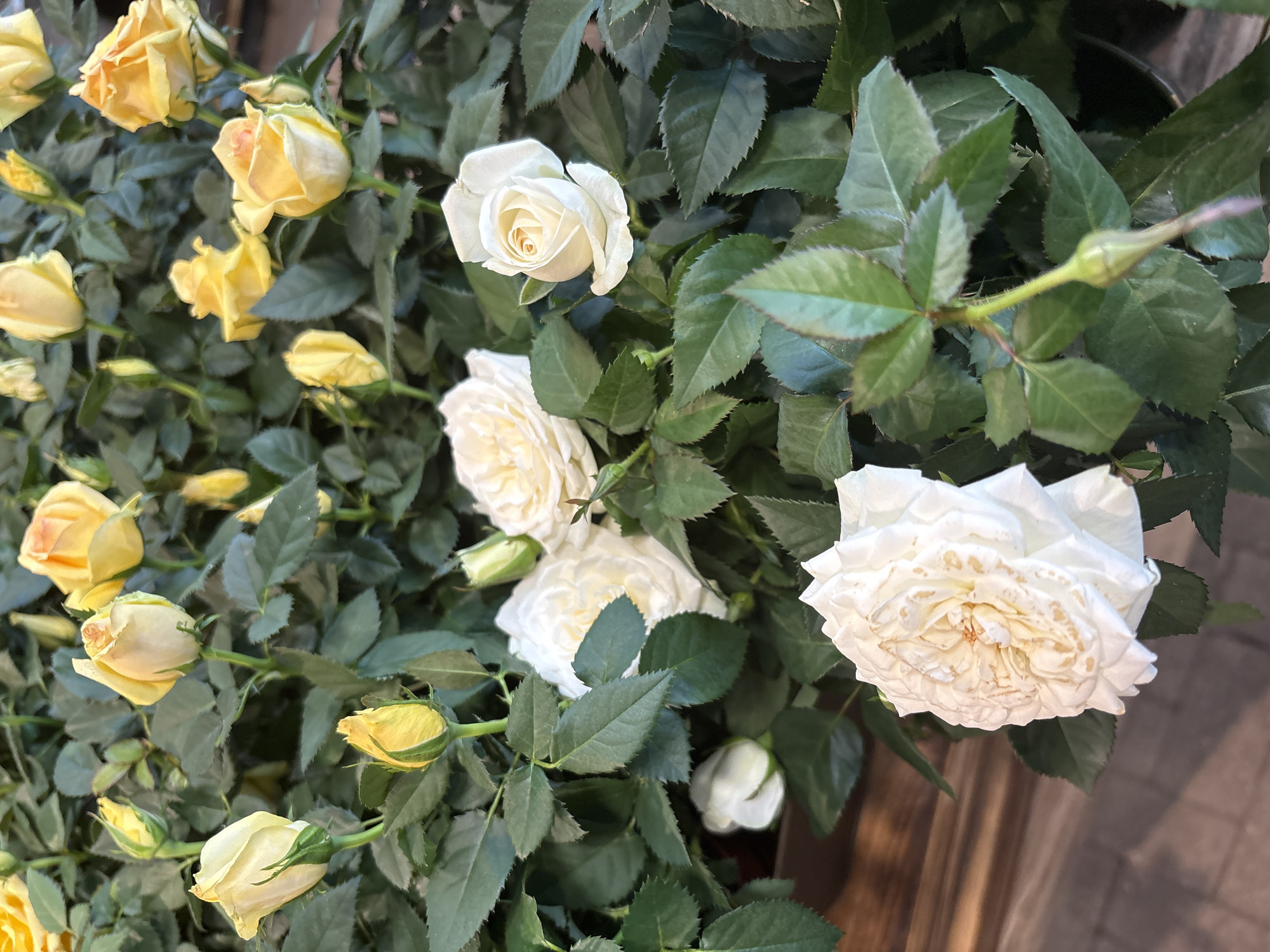 cluster of roses. Some roses are yellow and some are white. The roses are surrounded by green leaves. There is no visible indication of a specific location in Oswestry, United Kingdom.