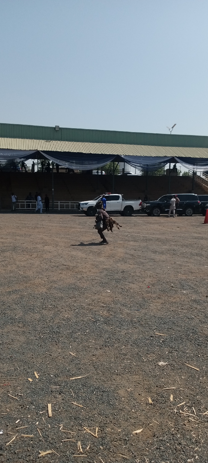 The scene is located in Jimeta, Nigeria, depicting an outdoor event space under a clear, light blue sky. The ground is a blend of light brown soil and dark grey gravel, with scattered light-colored wood fragments. In the central foreground, a single individual is captured in a dynamic, forward-leaning stance, facing towards the right. This person wears dark clothing on the lower body and an upper dark garment. Multiple light brown, possibly tanned animal skins or hides are draped over their back and right shoulder, forming a clustered mass. A distinct shadow is cast to the left of this individual. In the midground, a white metal barrier or fence runs horizontally. Behind this barrier, a line of vehicles is parked. From left to right: a white pickup truck with a red light bar on its roof is visible, with a person in blue attire standing near its driver's side. To the right of the pickup, a dark-colored SUV is parked, with a person in light traditional attire standing near its rear. Another dark SUV is partially visible further right, with an orange traffic cone in its vicinity. Several other individuals are standing or walking near the barrier and vehicles. The background features a large, tiered structure, resembling stadium seating or bleachers. This structure has a light green corrugated metal roof, beneath which a dark blue mesh or netting is suspended, forming a canopy. The seating tiers appear to be made of concrete or an earthen material. Multiple people are observable seated or standing within the upper sections of this structure, some looking towards the foreground activity. A light pole with a solar panel array is visible against the sky, rising above the green roof on the right side of the frame.